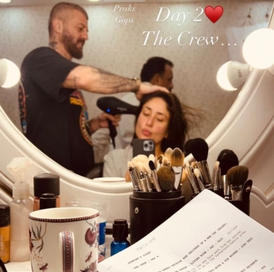 Mumbai, April 5 (IANS) Bollywood actress Kareena Kapoor Khan, who is receiving the audience appreciation for her streaming chat show ‘What Women Want’, shared a picture from the sets of her film ‘The Crew’ on Wednesday.