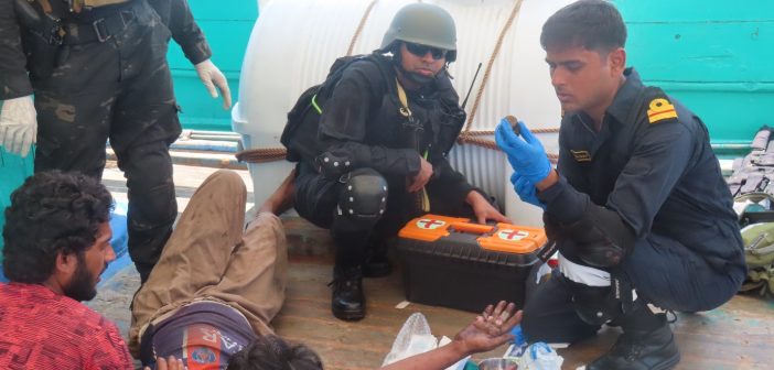INS Trikand immediately altered course to provide the required medical assistance. A team comprising the ship’s medical officer, Marine Commandos (MARCOS), and the Ship’s Boarding Team boarded the FV Abdul Rehman Hanzia to administer emergency care. The injured fingers were sutured and splinted under local anesthesia during a complex surgical procedure lasting over three hours. The swift and effective intervention prevented gangrene, thereby avoiding potential permanent loss of the injured fingers.