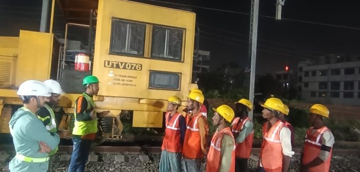 Track linking has progressed across multiple sections, supported by ballast formation and unloading of rail panels. Ongoing work includes yard remodelling, platform development, and COP foundations.